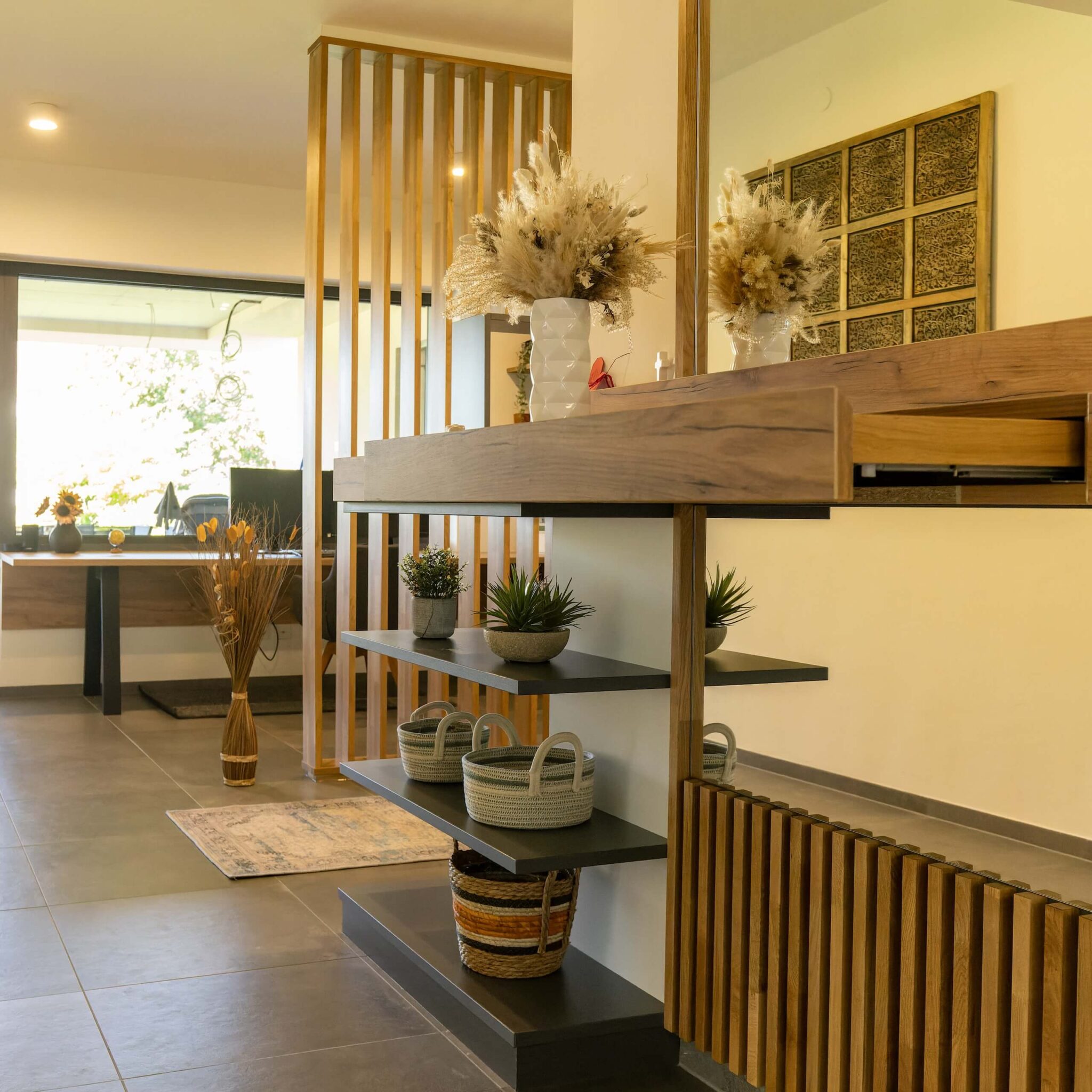 Ein Raumteiler in Eiche-Massiv bildet eine offene Trennung zwischen Bürobereich und Eingangsbereich.