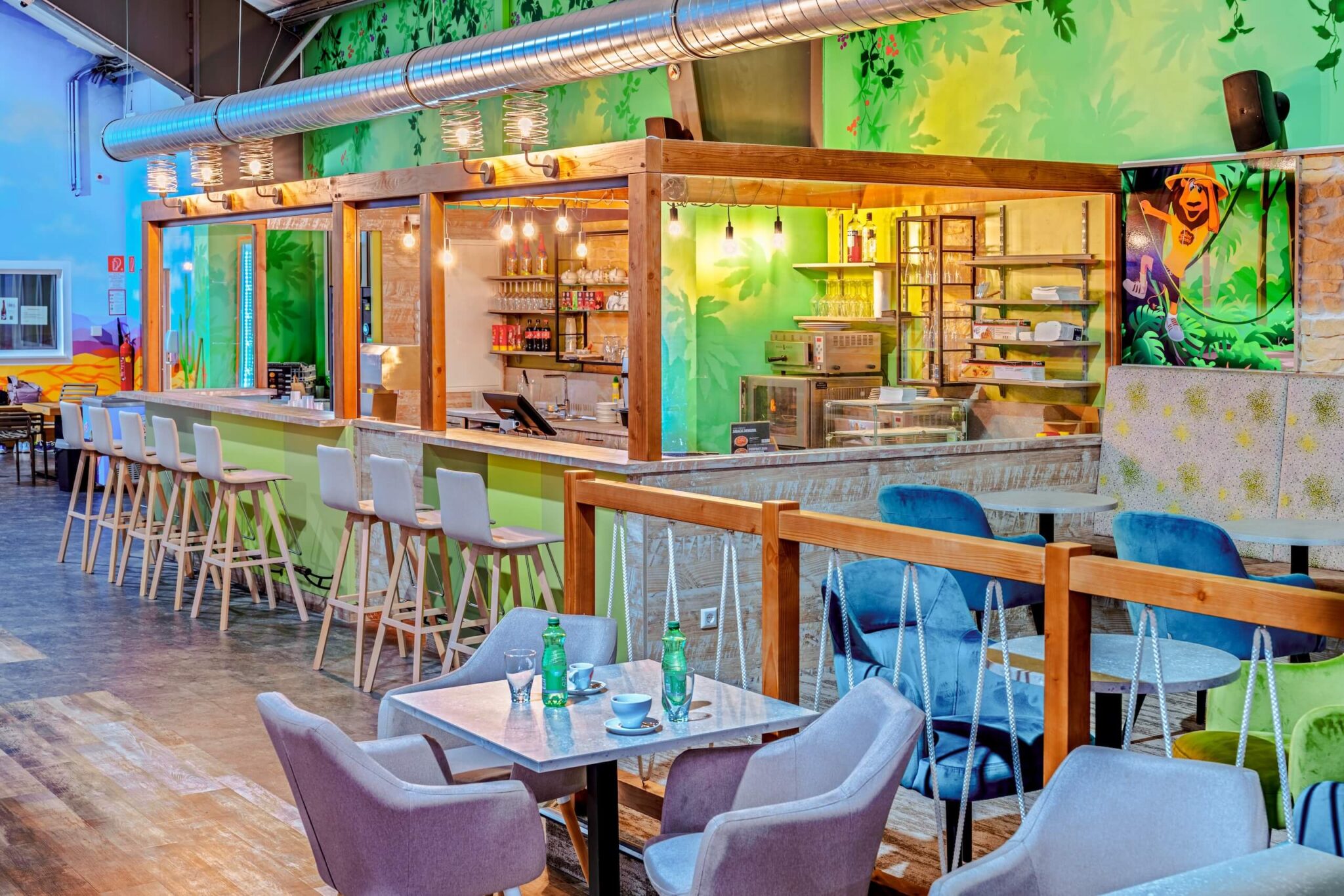 Die Bar ist das lebendige Herzstück des Gastronomiebereichs und besticht durch ihre offene, kommunikative Struktur und das farbenfrohe, tropische Design. Warme Holzoberflächen treffen auf frische Grüntöne, großflächige Dschungel-Motive und spielerische Akzente, die Kinder wie Erwachsene gleichermaßen ansprechen. Funktional durchdacht, bietet die Bar sowohl eine hochwertige Ausstattung für den Servicebetrieb als auch großzügige Sitzbereiche für kleine und große Gäste.