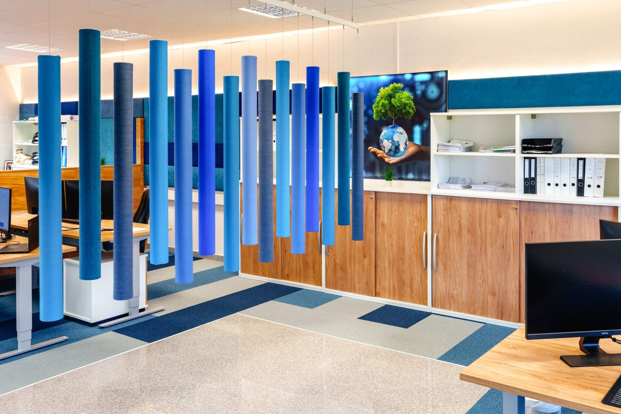 Die Kombination aus natürlichen Holzoberflächen, abgestuften Blautönen und akustisch wirksamen Elementen sorgt für eine angenehme Arbeitsatmosphäre und ein harmonisches Gesamtbild. Indirekte Beleuchtungen sorgen für Wohlfühlatmosphäre im stressigen Büroalltag.